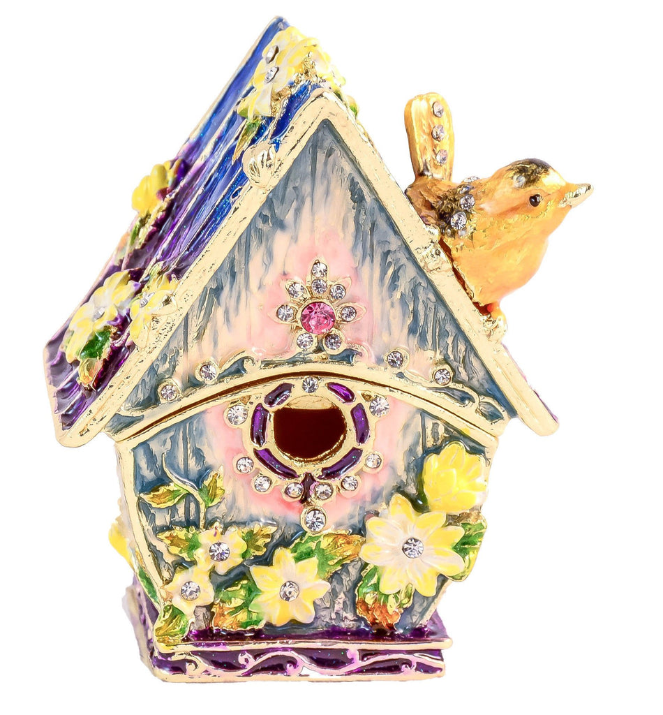 Bird House Trinket Box – Hand Painted Enamel with Austrian Crystals – Collectible Gift Box