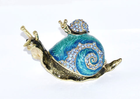 Snail with Baby Snail Trinket Box. Blue Enamel with Austrian Crystals Gold Plated