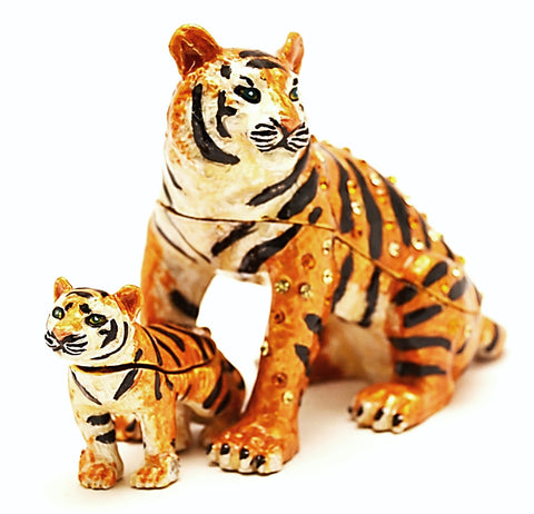 🐅 Tiger with Baby Trinket Box – Hand Painted Enamel with Austrian Crystals – Collectible Keepsake Box