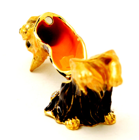 The figurine is hand-painted in rich brown enamel and adorned with hand-set Austrian crystals for an elegant sparkle. The hinged design features a magnetic closure, making it perfect for storing rings, earrings, or other tiny treasures. The interior is finished with smooth enamel for a polished touch.