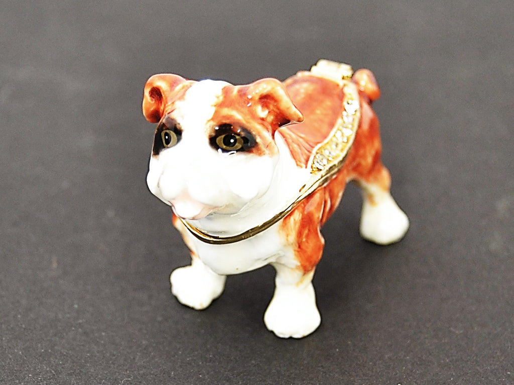 Add charm and elegance to your collection with this Small Bulldog Trinket Box, a unique hand-crafted design from skilled artisans. Made from durable pewter, it features a hand-painted enamel finish, accented with sparkling hand-set Austrian crystals, and plated in shimmering gold.