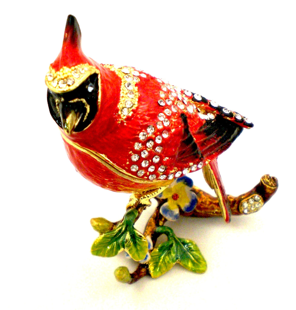 Lovely Cardinal in true red enamels and plated in 24k gold, perched on a branch.