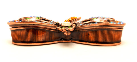 Celebrate the beauty of nature with this stunning Dragonfly Trinket Box by Ciel Collectables. Crafted from durable pewter metal, this elegant keepsake box features hand-painted brown enamel with copper plating, adorned with hand-set multi-color Austrian crystals that sparkle from every angle.