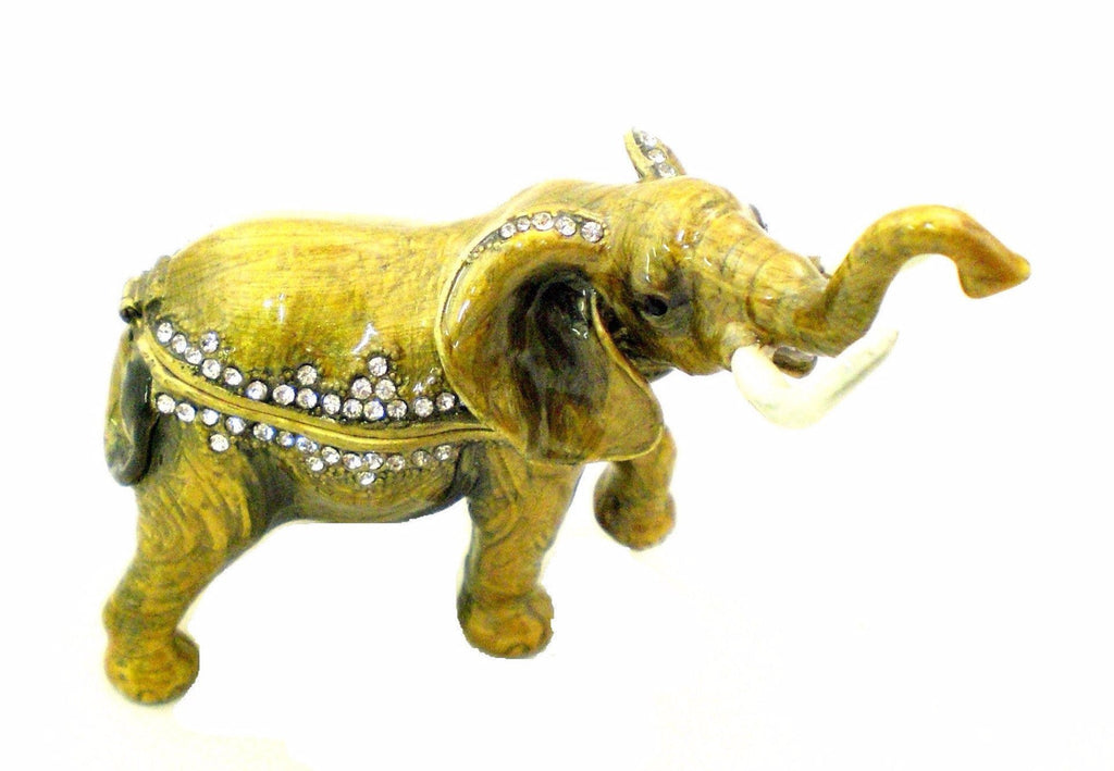 This Ciel Collectables elephant trinket box is a beautifully handcrafted keepsake that blends elegance with artistry. Expertly hand-painted in warm brown enamel, it is adorned with hand-set Austrian crystals and finished in antique brass plating for a vintage-inspired look.