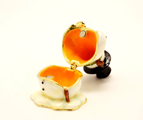The snowman opens with a hinged magnetic closure, revealing a beautifully finished enameled interior – perfect for storing small keepsakes, jewelry, or tiny holiday treasures.